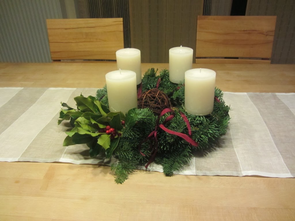 Ich habe dieses Jahr nur ein Gesteck in einer älteren Backform. Eben, da der Kranz auf dem Tisch immer zu viel Platz einnahm und ich die Kerzen aber gern in der Tischmitte haben wollte. Ich hab' zwar noch ein zweites Gesteck mit nur einer Kerze, aber wir kommen gar nicht dazu, diese anzuzünden. 😉 Und allein mag ich sie nicht unbeaufsichtigt brennen lassen.