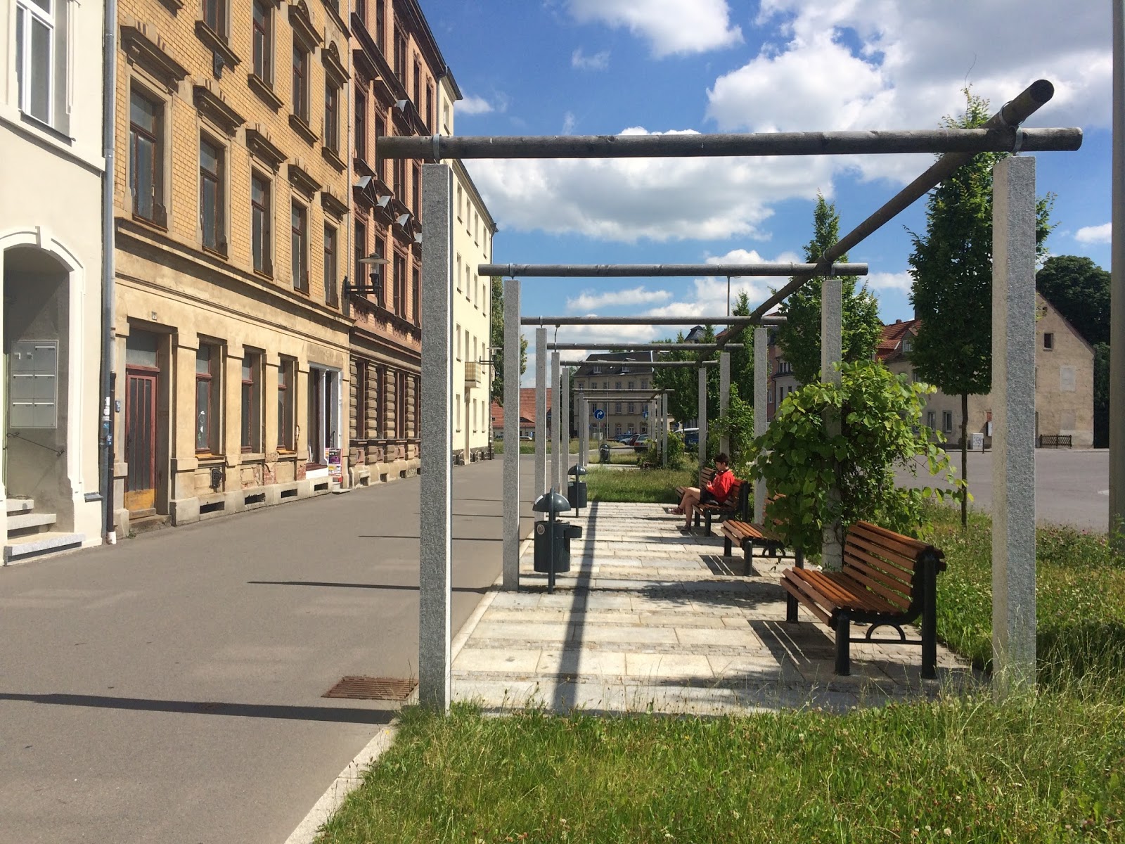 Die angepflanzten Bäume, die die Bänke sicher mal beschatten sollen sind eben noch total klein, das wird noch lang dauern…