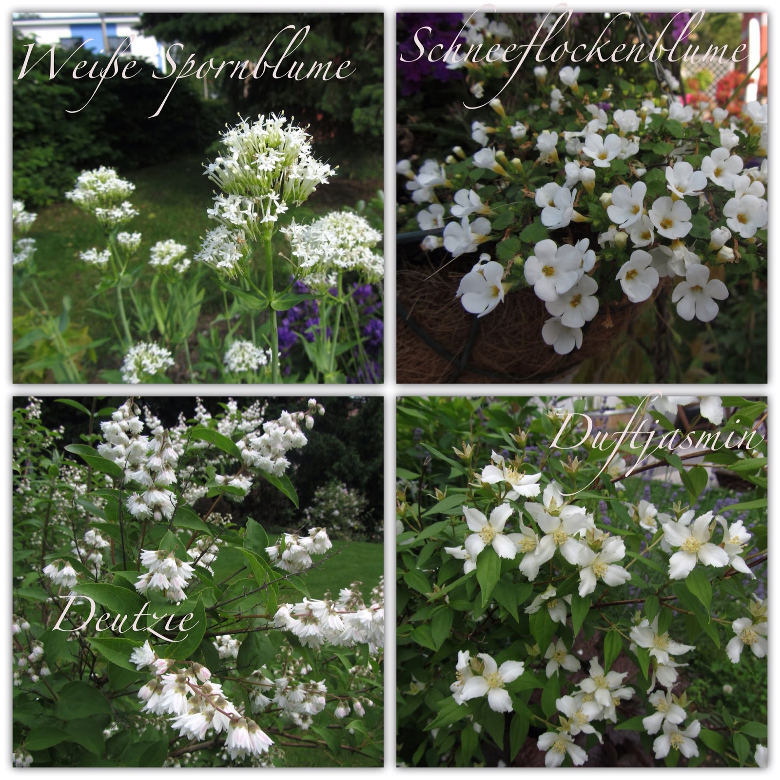 In Weiß blüht auch der Duftjasmin ‚Erectus‘ im Beet neben der Eule. Er wird nicht so groß, nur 1,5 m und macht damit nicht so viel Schatten.