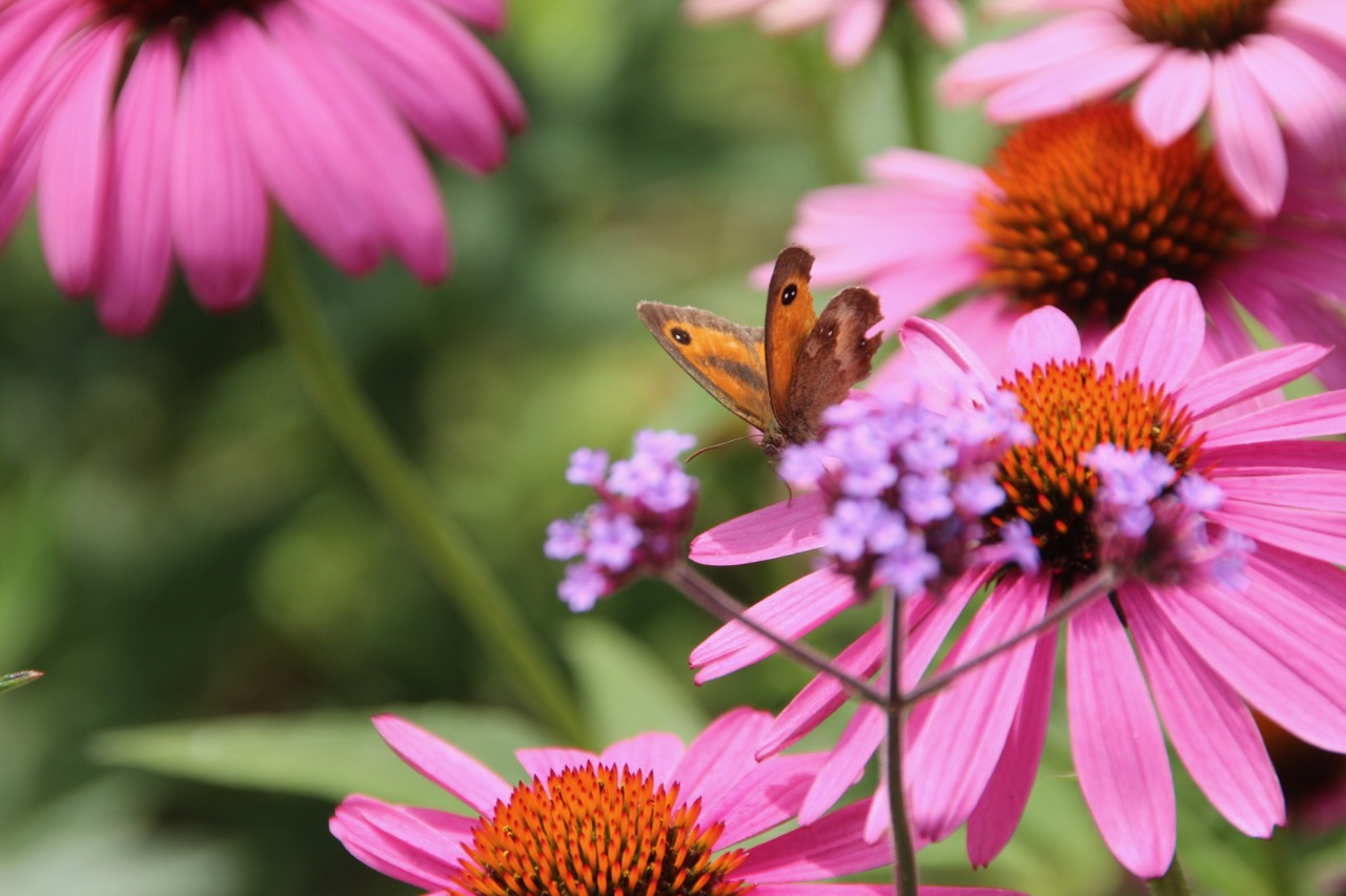 Am Sommerflieder ist nach wie vor Flaute, aber den Kleinen habe ich hier schon häufig herumflattern sehen. Ochsenaugen leben bevorzugt an Waldsäumen und Sandkiefernwäldern, regional auf Brachen und Böschungen im Offenland. Nektar suchen sie in angrenzenden blumenreichen Wiesen. Das trifft auf unsere Gegend wirklich zu.