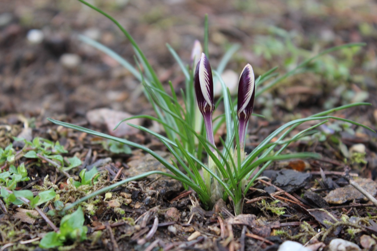 Ich sehe die ersten Wildkrokusse, die immer noch am falschen Platz wachsen, aber immer sehr von den den ersten Bienen angeflogen werden.