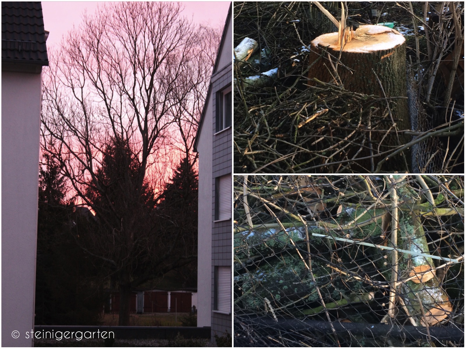 Vor vier Jahren wurde im Nachbarsgarten eine riesige Pappel gefällt, ich kannte sie solange ich hier schon wohne, das waren damals immerhin 37 Jahre, aber sie war viel, viel älter und riesengroß. In der Mitte waren schon tote Äste, der Baum ächzte im Winter und sie war eine Gefahr. An dem Tag als sie gefällt wurde habe ich geheult. Der Baum fiel in Teilen, ein riesiger Kran brachte den Mann mit der Säge in die Baumkrone.