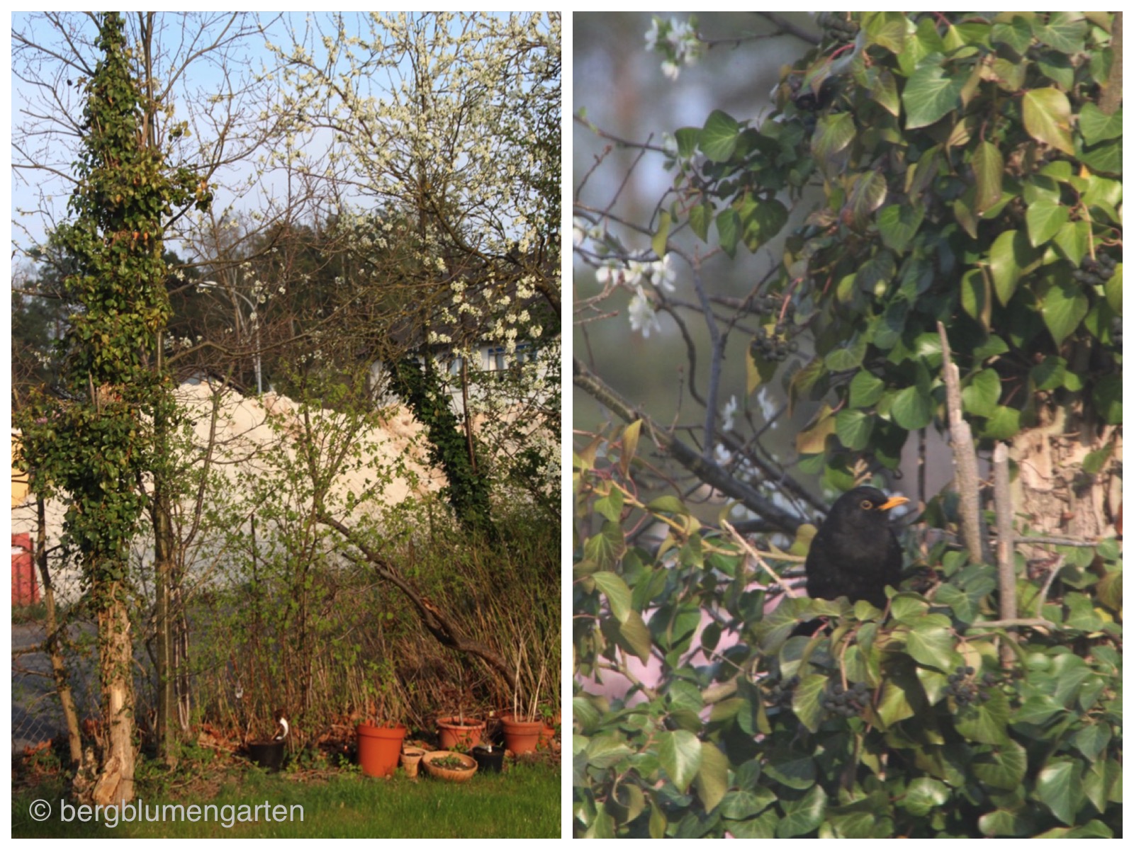 Wenn wir schon bei den Vögeln und Beeren sind….die Amseln haben den Garten für sich erobert und naschen nun, nachdem das Vogelfutter alle ist, die Efeu-Beeren.
