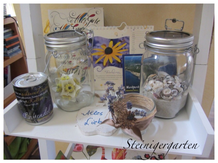 Auch bei mir haben im Sommer zwei Sonnengläser Einzug gehalten. Im rechten Glas ist der Sand vom Ostseestrand, im linken eine Origami-Blüte