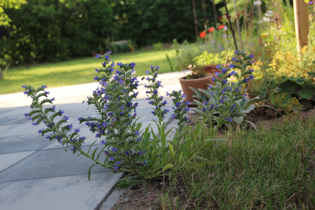 Nur eine einzige Pflanze, aber mit unzähligen Blüten bestückt, blüht hier im sandig kargen Boden an der Terrassenkante, der Natternkopf. Die Rosette wurde wohl glücklicherweise nicht vom Rasenmäher oder anderen Schneidegeräten erwischt, denn die Pflanze ist sogar zweijährig.