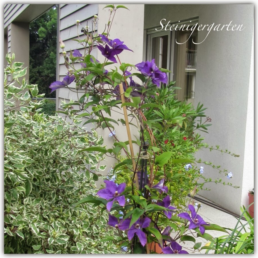 Nicht schlecht gestaunt habe ich über diese wieder auferstandene Clematis ‚President‘. Sie brauchte nun eine neue Rankhilfe, die sich schnell als zu klein erwies.