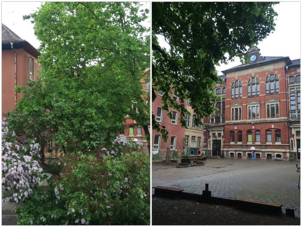 Das überdachte Treppenhaus der Kirche diente mir als Regenschutz…und ich hatte Zeit, die Schule von dort in aller Ruhe zu betrachten und den Gedanken freien Lauf zu lassen….