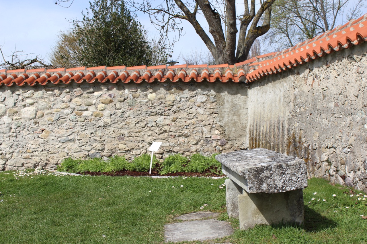 Die Klostermauern schützen den Garten noch zusätzlich. Die Bank lädt zum Verweilen ein.