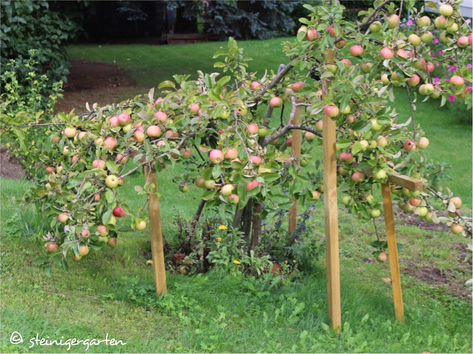 Der Topaz-Apfelbaum hat sich eindeutig übernommen. Er wächst viel zu sehr in die Breite und ich rätsele noch, ob man dieses Verhalten mit einem ordentlichen Schnitt verhindern kann.