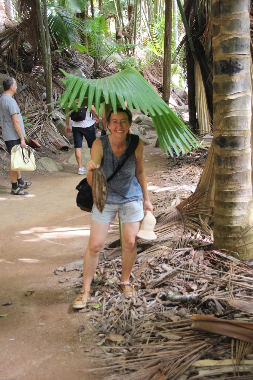 Nein, der Sonnenhut in meiner Hand ist nicht aus dem Palmwedel und in der anderen Hand halte ich die Samenhülle einer Seychellen-Palmenart. LG