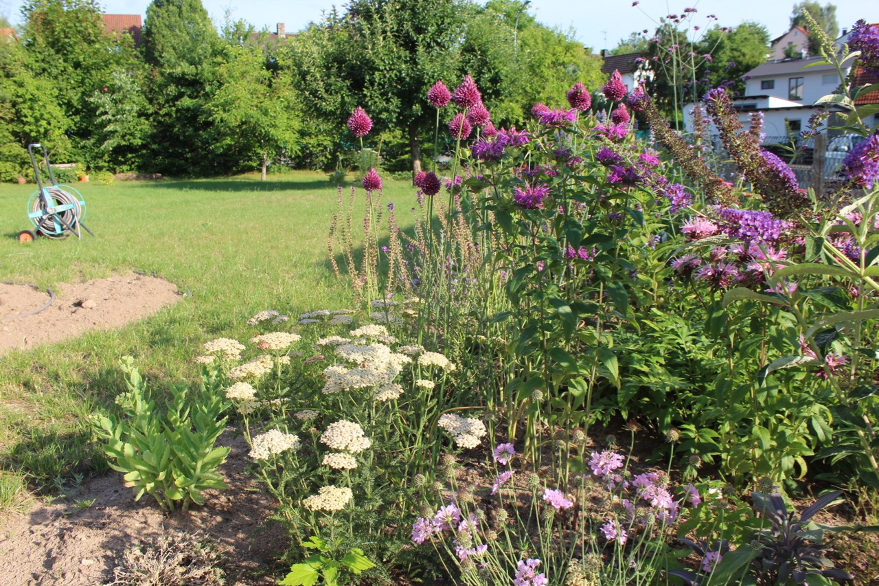 Zu sehen sind hier im Moment die zwei verschiedenen Monarden, Schafgarbe, Tauben-Skabiose, Salvia nemorosa , Trommelstocklauch, Phlox und Hohe Katzenminze. Auf die speziellen Sorten gehe ich heute mal nicht ein, sonst wird es zu viel.